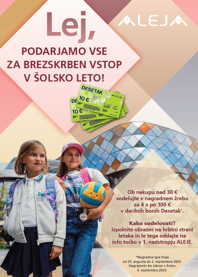 V naši najmodernejši nakupovalni destinaciji bodo zadnji dnevi počitnic polni otroške energije, zanimivih dogodkov in priložnosti za zabavo ter učenje. Tik pred začetkom novega šolskega leta, od ponedeljka, 25. avgusta, do torka, 2. septembra, ne spreglejte številnih aktivnosti, ki so jih pripravili ob pričetku novega šolskega leta. Ne spreglejte pa tudi bogate nagradne igre »Lej, podarjamo vse za brezskrben vstop v šolsko leto!«, v kateri bodo podelili 400 evrov v darilnih bonih DESETAK, v vrednostih 4 × 100 evrov. V nagradni igri lahko sodelujete ob vsakem nakupu nad 30 evrov, več o nagradni igri pa si lahko preberete na spletni strani ALEJE.