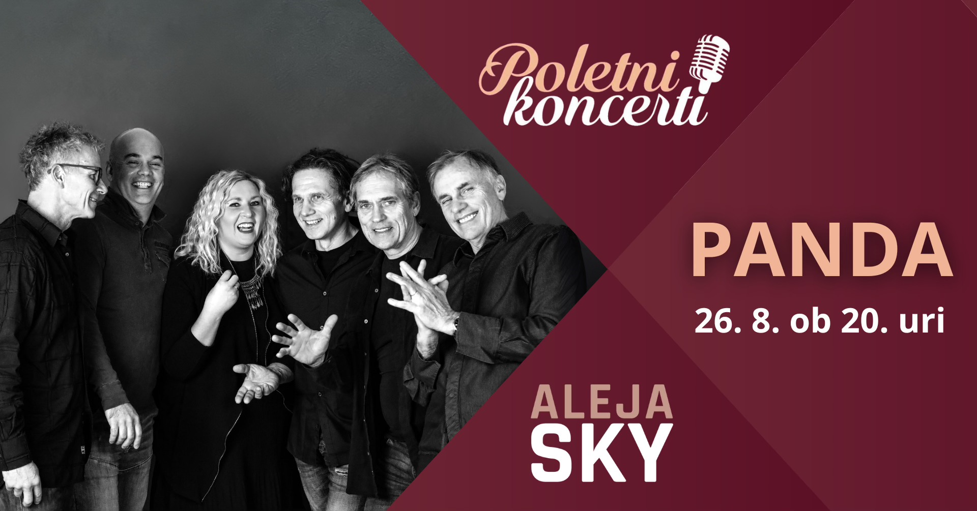 Zadnji počitniški teden bo v ALEJI vesel in poln zanimivih aktivnosti. V torek, 26. avgusta, se nadaljuje karavana uspešnih torkovih after-work koncertov, tokrat z legendarno skupino Panda. Pričakujte zimzelene uspešnice, kot so Sive ceste, Daleč strani in Ti & jaz. Na septembrskih izvedbah koncertov se bodo na odru zvrstili Balladero, aktualni zmagovalec festivala Melodije morja in sonca Dare Kaurič in predstavnica Slovenije na Eurosongu 2011 Maja Keuc. Celoten program koncertov najdete na povezavi, brezplačne vstopnice pa lahko prevzamete na info točki ALEJE.