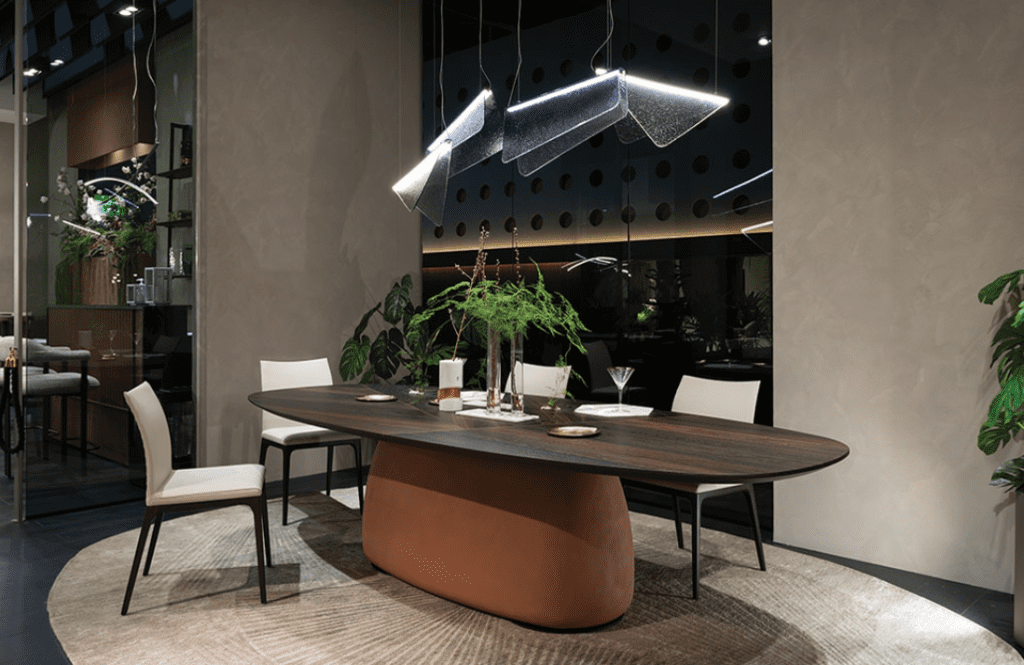 Oblike se prilagajajo novim potrebam po fleksibilnosti. Okrogle jedilne mize pridobivajo na priljubljenosti v manjših mestnih stanovanjih, saj spodbujajo bolj demokratičen pogovor in mehčajo stroge linije sodobne arhitekture. Po drugi strani pa v večjih hišah kraljujejo dolgi, pravokotni formati, ki zmorejo gostiti ne le družine, temveč tudi širši krog prijateljev. Koncept “počasnega bivanja” (slow living) se tukaj neposredno zrcali v opremi – miza ni več le odlagalna površina, ampak oder za socialno interakcijo.