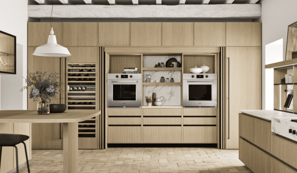 Čeprav se jedilni prostor osamosvaja, ostaja povezava s prostorom za pripravo hrane ključna, a v precej bolj premišljeni obliki. Sodobne kuhinje v letu 2026 niso več zgolj delovne postaje, polne bleščečih aparatov, temveč se vizualno vedno bolj zlivajo z bivalnim pohištvom. Trendi kažejo na uporabo naravnih materialov, kot so kamen, les s poudarjeno teksturo in matirane površine, ki ne vpijajo prstnih odtisov.