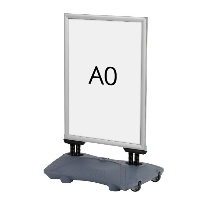 Podstavek se lahko napolni z vodo ali peskom, kar zagotavlja stabilnost tudi v močnem vetru. Zaradi vzmetnega mehanizma se stojalo nežno upogiba, s čimer se zmanjšajo obremenitve na konstrukcijo, plakat pa ostane lepo razporejen in viden.
